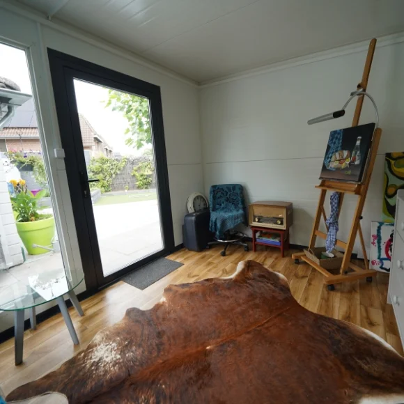 Il était crucial pour nous de concevoir un espace lumineux, baigné de lumière naturelle. Nous avons relevé ce défi en installant un grand panneau de fenêtre en verre de 800x1100mm, ainsi qu’une fenêtre inclinable et pivotante sur le côté, permettant l’entrée d’air frais. De plus, notre Studio de Jardin est doté d’une porte en acier munie d’une grande fenêtre vitrée, augmentant ainsi l’apport en lumière naturelle.
